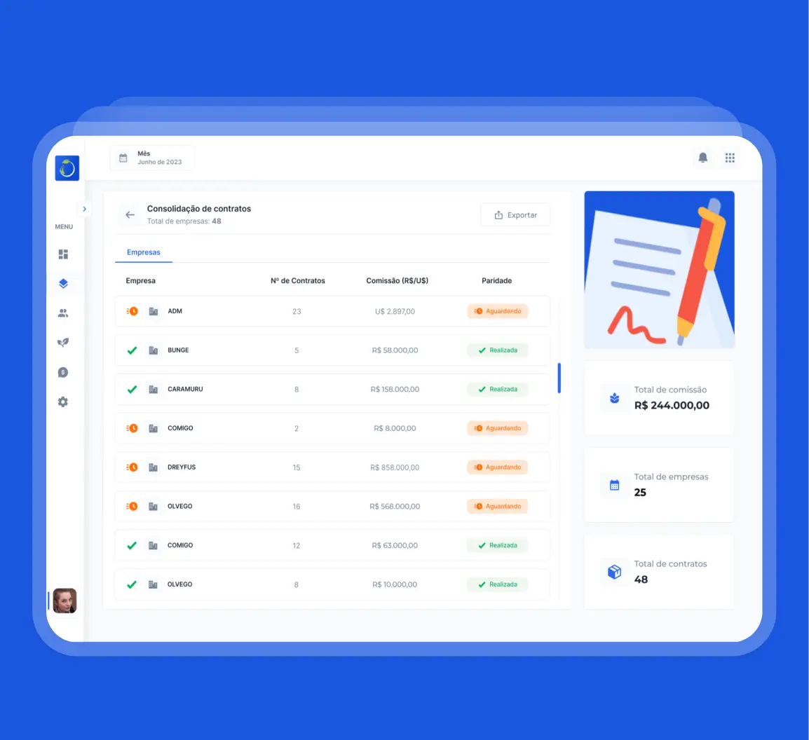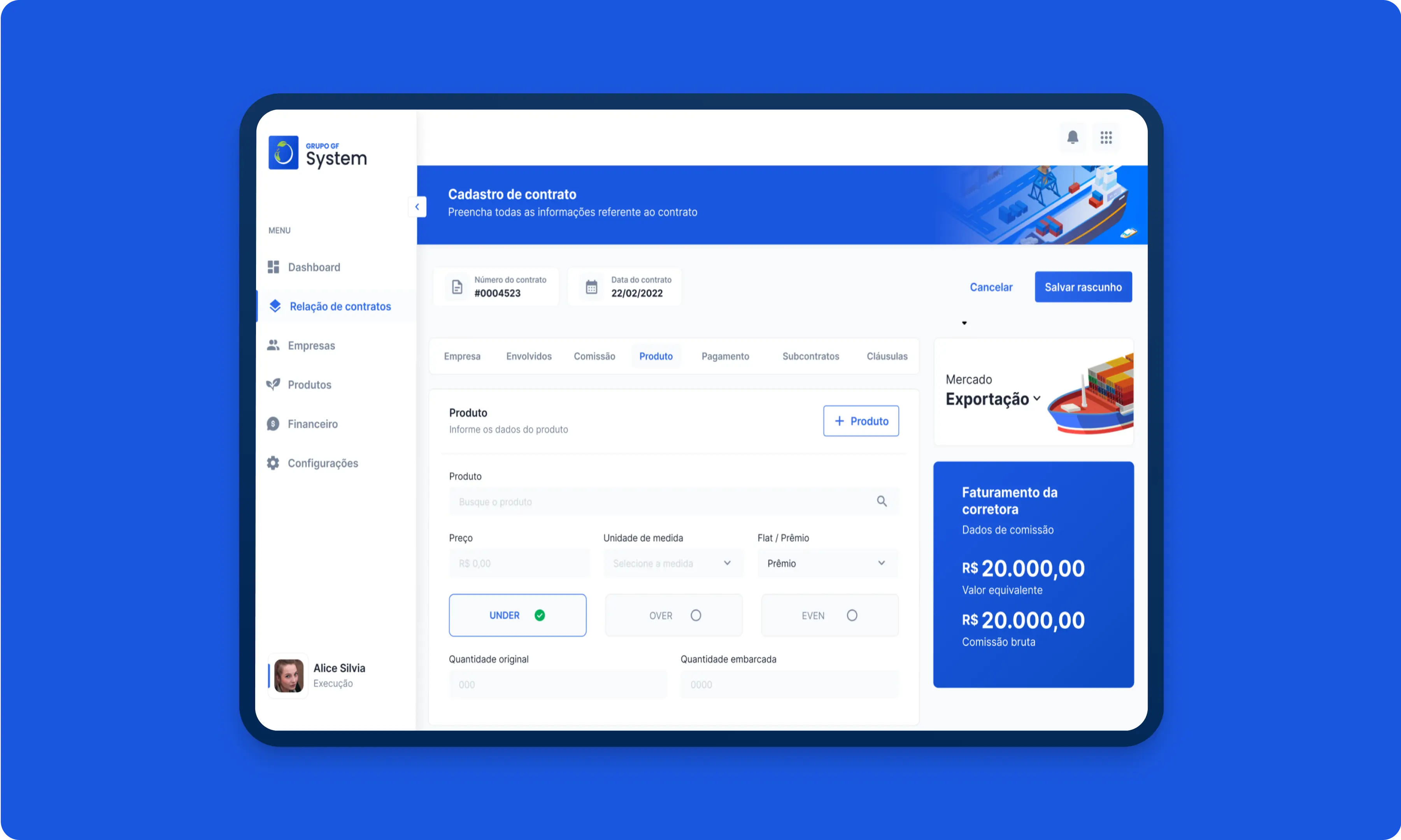 Meu desafio era construir o módulo financeiro da plataforma, uma área vital para a gestão eficiente de contratos, despesas, faturamento, comissionamento, fluxo de caixa e relatórios estratégicos.